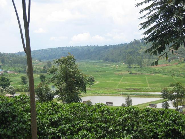 achtergrond: visvijvers en rijstvelden